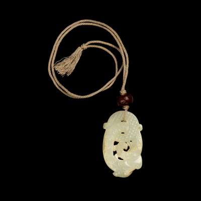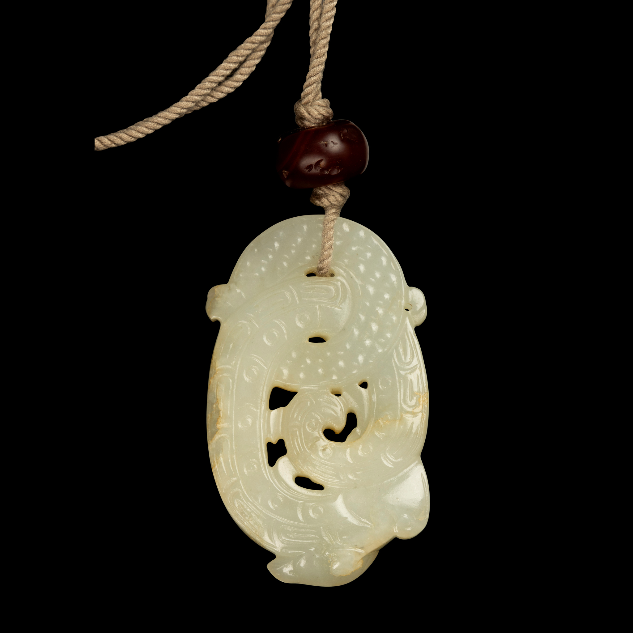 carved in openwork with an elephant-headed sinuous creature forming an oval loop intertwined with a circular bi disc, the lower end further carved into a small mouse, the stone of white tone with some russet inclusions, together with an old agate bead in red tone