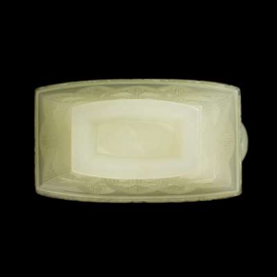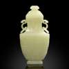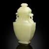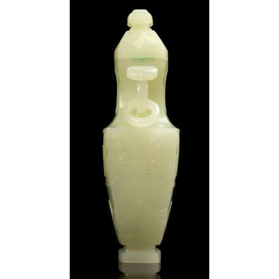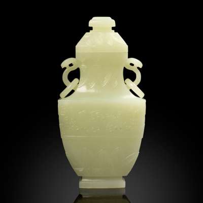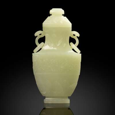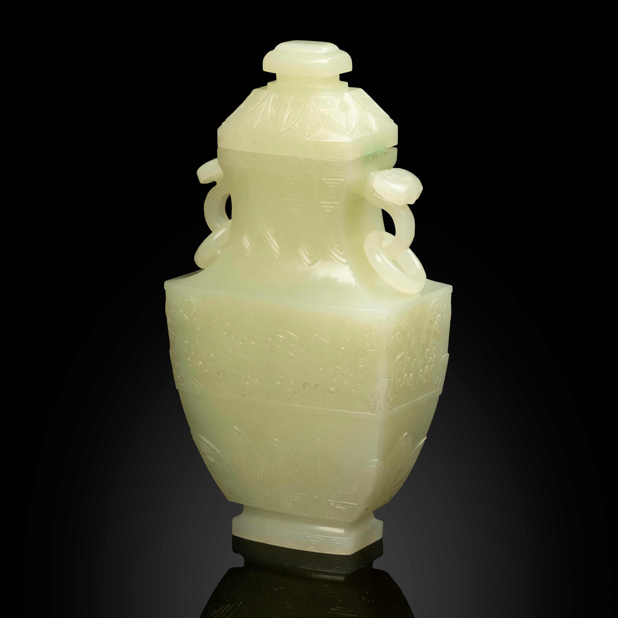 The taste for archaism during the Qing Dynasty is embodied in this vase, which draws its inspiration from archaic inlaid bronzes and reinterprets them. While the bands of taotie masks featured on Chinese bronzes from the Neolithic period, they have been stylised and placed on a vessel of modern silhouette and contemporary ruyi-sceptre handles. A closely comparable Qing dynasty example with taotie mask decoration, also similar in the square-sectioned body, is the collection of the National Palace Museum, Taipei, museum no. Gu Yu 故玉 253. Another white jade vase with similar design of ruyi-sceptre handles and looped ring, is also in the collection of the National Palace Museum, Taipei, museum no. Gu Yu 故玉 242.