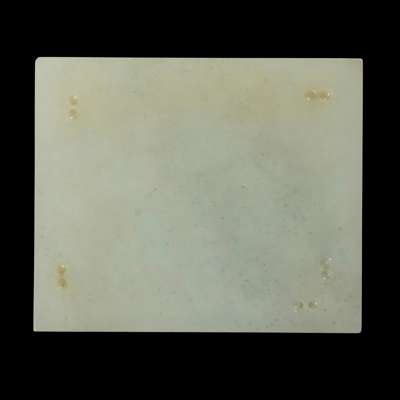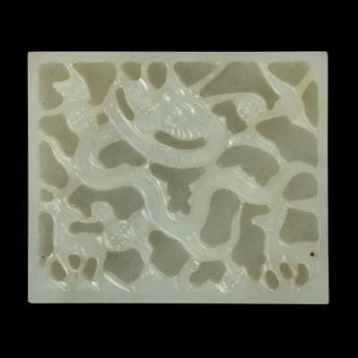 of rectangular shape, carved to one side with a writhing three-clawed dragon in the centre, with two deer on the lower ends and birds on the upper corners, all above breaking waves, the other side with four pairs of drilled holes at the corners