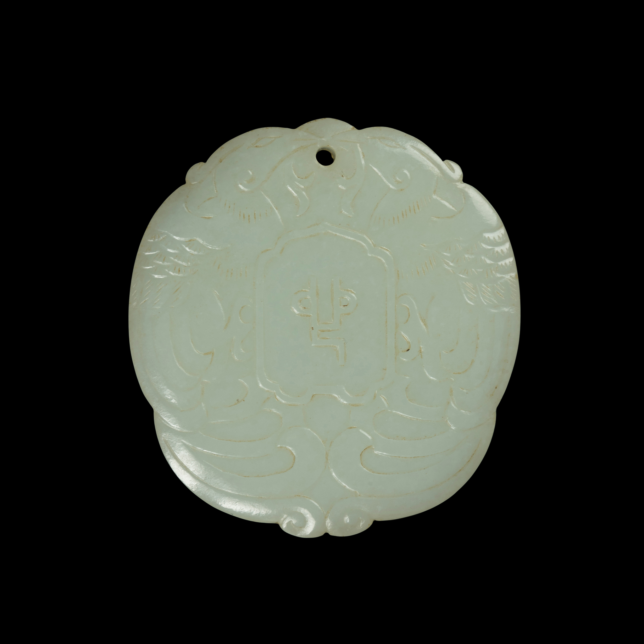carved in low relief on both sides with a character in the middle, respectively reading as ‘Tong’ and ‘Xin’ (together meaning ‘with one heart’), flanked by a pair of birds carrying the same branch in their beak, the stone of even white tone