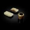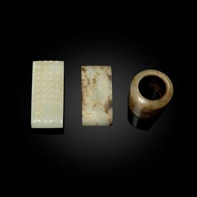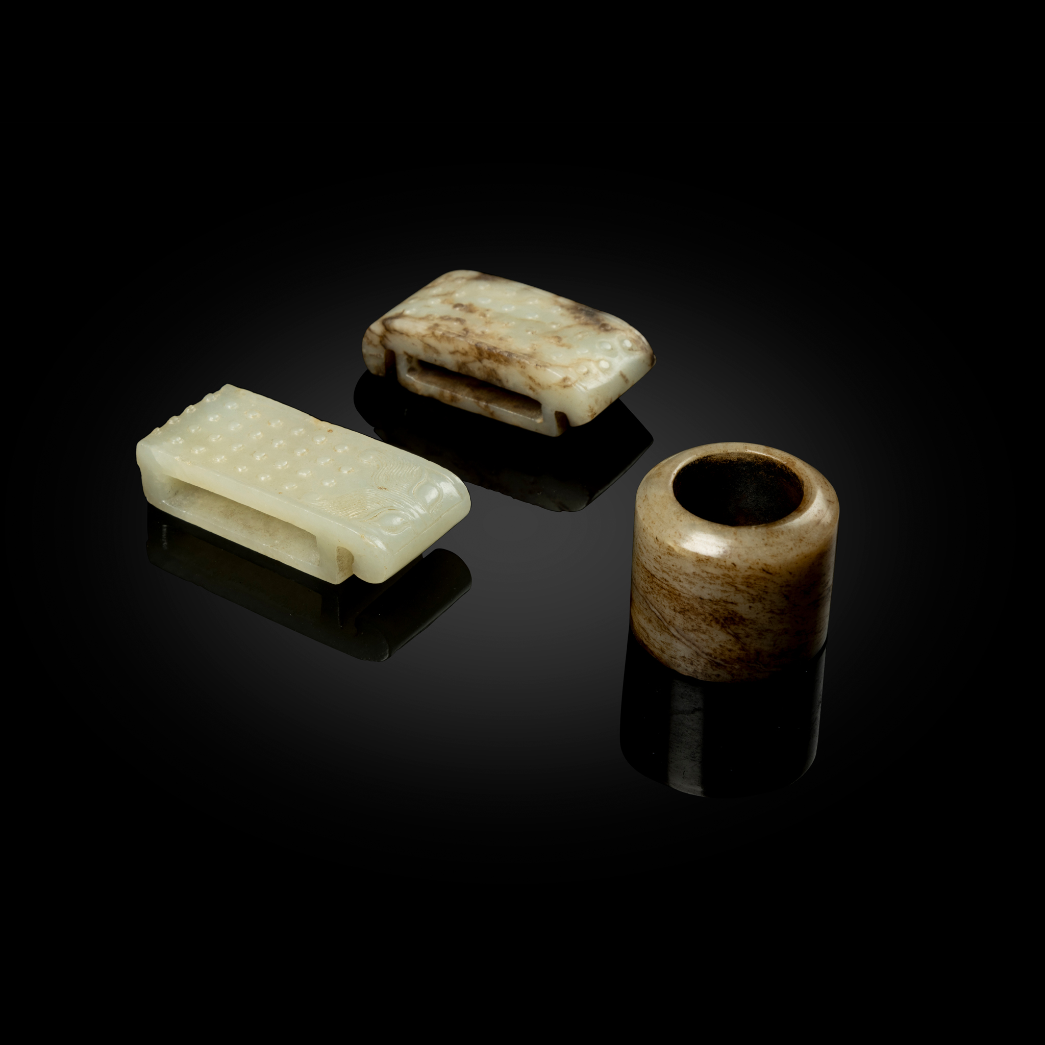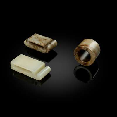comprising: one white jade scabbard slide with raised dot pattern and taotie mask on one end; one white jade with russet inclusion scabbard with raised dot pattern; and one white jade with russet inclusion ring (3)