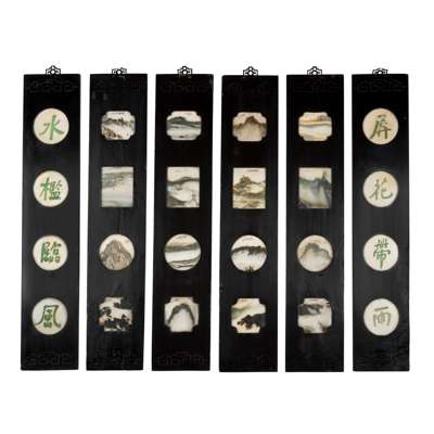 comprising: four wooden panels containing sixteen marble slabs, each panel with four shaped windows showcasing the black, grey, and russet veining evocative of ethereal landscapes shrouded in swirling mists and clouds, all inscribed with poetic titles, signed 'Shi Lin', 'Song Quan', sealed ‘Shi Quan’ and others; and two wooden panels containing eight marble slabs, carved and painted in green with a poem (6)