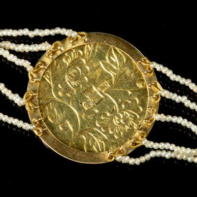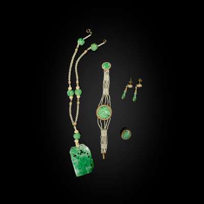 comprising: one necklace composed of a rectangular jadeite plaque with reticulated carved chi-dragon together with jadeite and pearl-like beads; one pair of tear-shaped jadeite earrings; one jadeite inset ring; and one jadeite inset gold base bracelet with pearl-like strings, the gold base with ‘Zu (pure)’, ‘Jin (gold)’ and ‘LIU’ mark (4)
