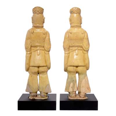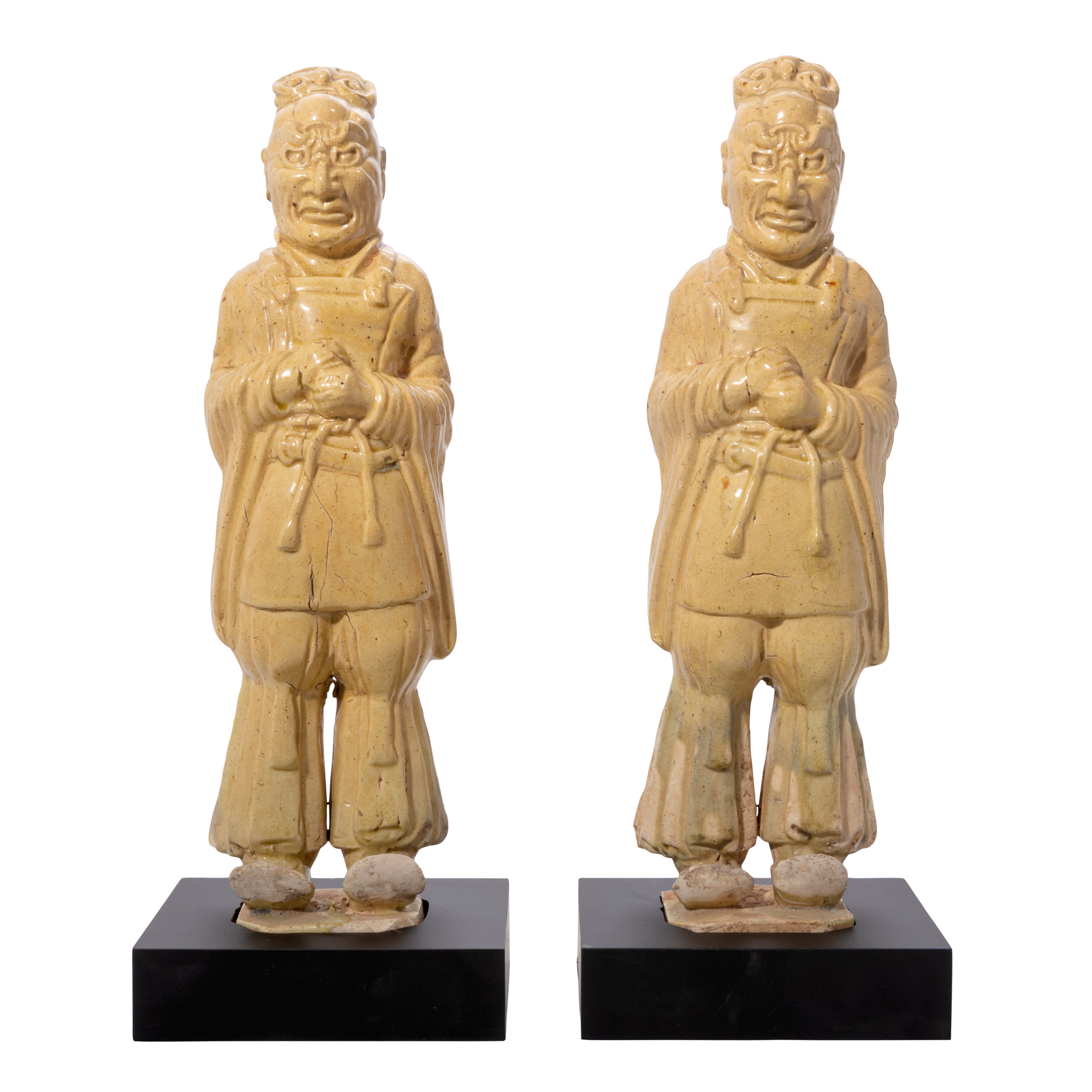 each modelled as a standing official, wearing a breastplate and long trousers tied above the knee, the hands clasped before chest, the face detailed with serious expression, covered overall in a creamy yellow glaze, with a black square base (2)