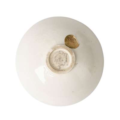 the small bowl supported on a short foot, with slightly curved sides, covered overall in a white glaze with ivory tinge, the unglazed base with remnant of ink; together with a bronze water dropper moulded in the form of a Buddhist lion-dog, with a circular opening on its back (2)