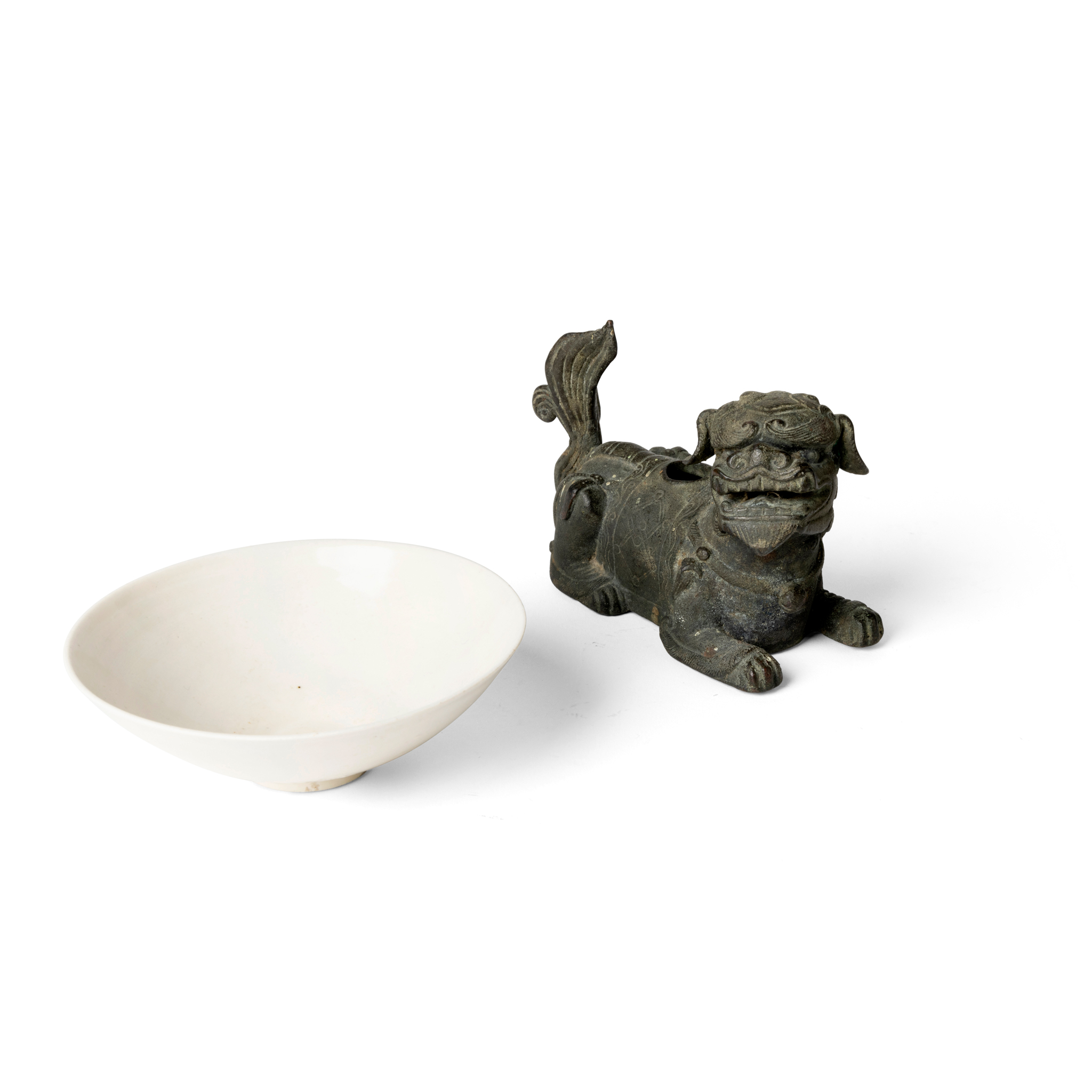 CHINESE DING-TYPE WHITE-GLAZED BOWL AND BRONZE LION-DOG WATER DROPPER