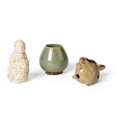 finely moulded as a boy playfully riding a Buddhist lion dog, covered in a translucent white glaze with ivory tinge; together with a Changsha-style bird form whistle and a celadon-glazed small jar (3)