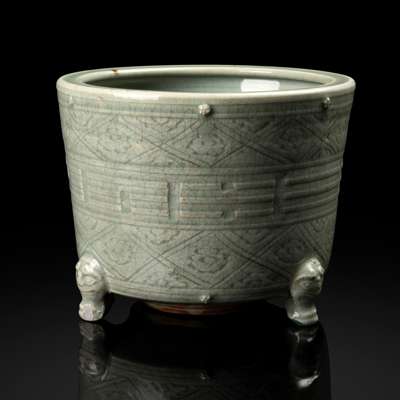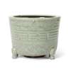 sturdily potted, of tapering cylindrical shape raised on three cabriole legs decorated with mythical beast masks, the exterior moulded with the eight trigrams and freely carved with trellis ground further with rosettes, covered in a celadon glaze of greyish-green tone suffused with fine craquelure inside out