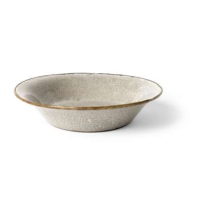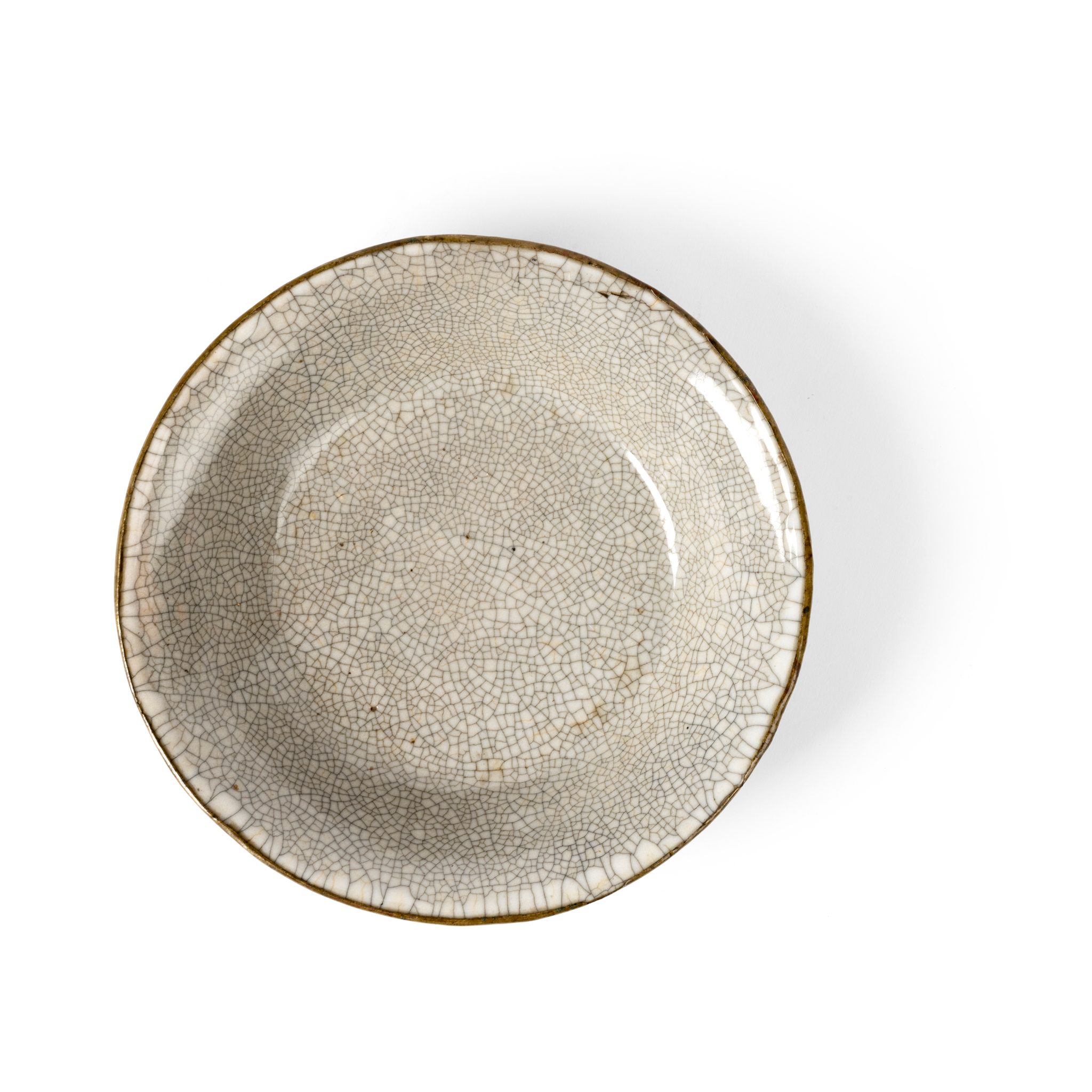 thinly potted with everted rim, the mouth rim with brass mount, covered overall save for the 'iron' foot with greyish ivory glaze with a network of faint russet crackles