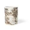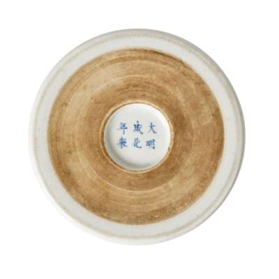 of cylindrical form, painted on one side with a shed in a dense forest, two learned men served by a boy servant with a wine pot, one writing calligraphy, another drinking, the counter sunk base inscribed with a six-character Chenghua mark in underglaze blue