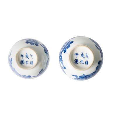 each finely painted with two tripod censers, books and other antiquities, the base inscribed with a six-character apocryphal Chenghua mark in underglaze blue (2)