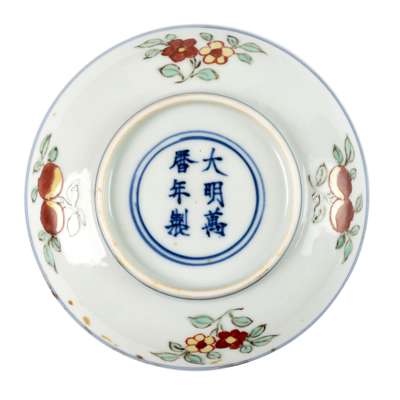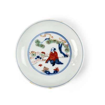 painted in the central medallion enclosed by two circles with a scholar seated underneath a pine tree on a shore looking at a lotus pond, the base inscribed with a six-character Wanli mark within a double circle in underglaze blue