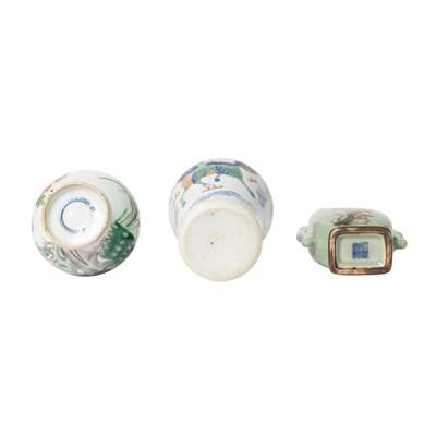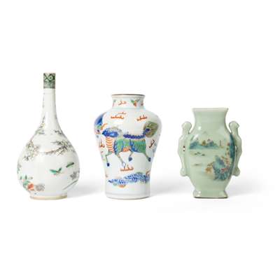 comprising: a famille verte ‘peacock and peony’ bottle vase, 22.5cm high; a wucai ‘qilin’ meiping vase, inscribed on the neck with a six-character Wanli mark, 18.2cm high; and a celadon-ground famille rose ‘bird and flower’ rectangular vase with handles, the base inscribed with a six-character Qianlong mark in underglaze blue, 16.2cm high (3)