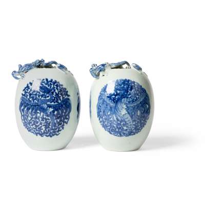 清末民初 乾隆款 青花夔鳳紋螭龍飾罐(一對)