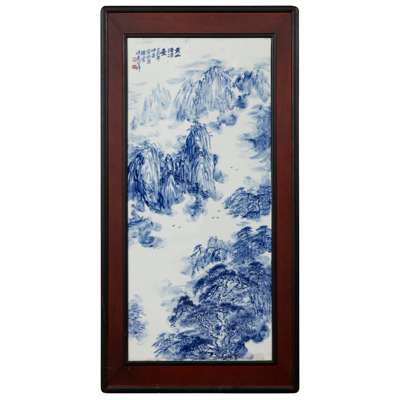 傅堯笙款 青花《黃山清涼臺》瓷板 木框