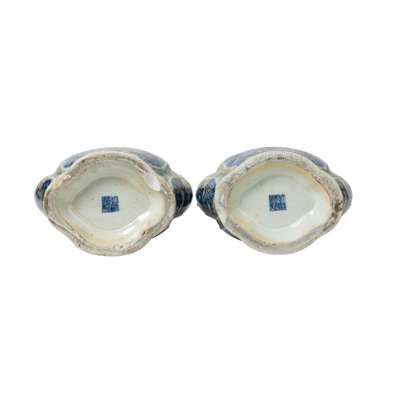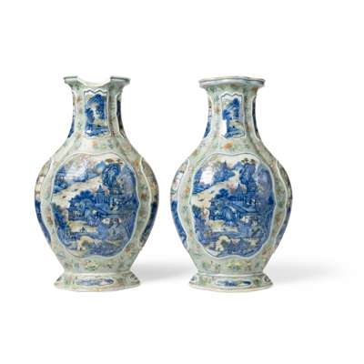 清乾隆款及年代 青花加彩山水塔寺人物紋海棠形瓶(一對)