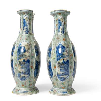 PAIR OF CHINESE UNDERGLAZE BLUE WITH FAMILLE ROSE ‘LANDSCAPE’ QUATREFOIL VASES