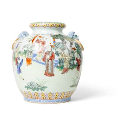 清嘉慶款及年代 粉彩嬰戲圖鋪首罐