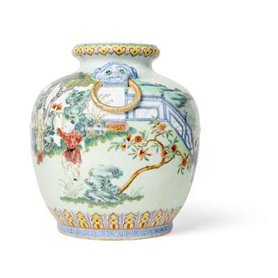 finely painted around the oval body with joyous boys playing in a garden, set on the shoulders with a pair of moulded lion heads holding rings as handles, the base inscribed with a six-character Jiaqing mark in iron-red