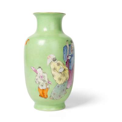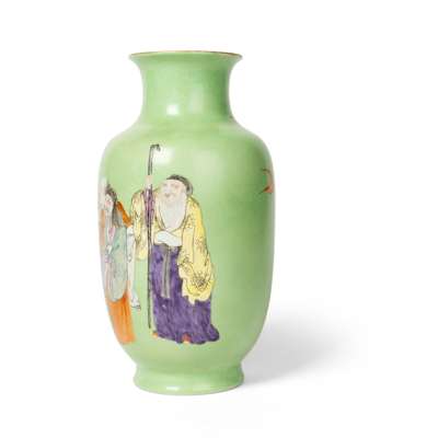 CHINESE LIME-GREEN-GROUND FAMILLE ROSE SGRAFFITO 'IMMORTALS' VASE