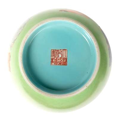 of baluster form, painted on one side with a gathering of immortals and some pinching lingzhi fungus in their fingers, reverse with three bats in flight, all against an incised lime-green-ground, interior and base covered in turquoise glaze, centre of the base inscribed with a six-character Qianlong mark in iron-red