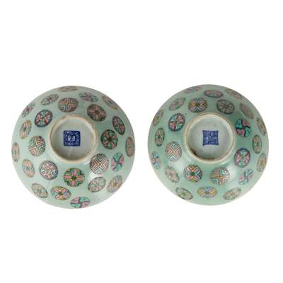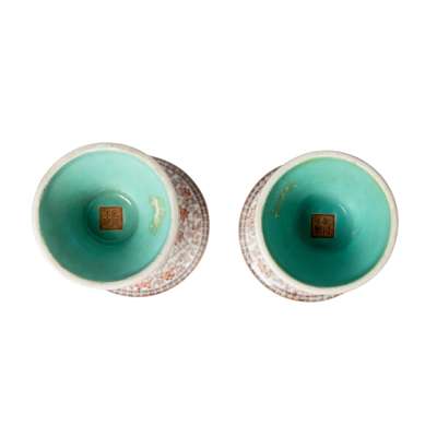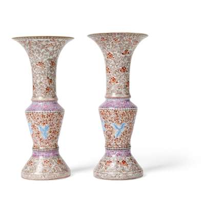 comprising: a pair of each famille rose ‘gu’ vases, each fine potted, the middle section painted with beribboned auspicious motifs separated by peaches against scrolling lotus, the trumpeted neck further with scrolling lotus, interior and the base covered in turquoise enamel, centre of the base inscribed with a four-character Qianlong mark within double-circle in iron-red; and a pair of celadon ground famille rose bowls, decorated with multi-coloured ‘flower balls’ inside out, the base painted with a pseudo-mark in underglaze blue (4)