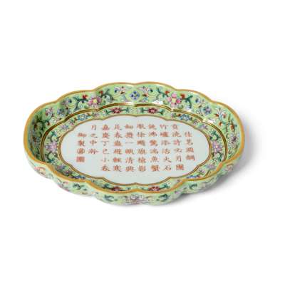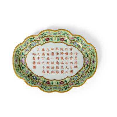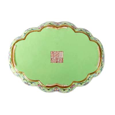 A comparable begonia-shaped tea tray decorated with imperial poem on green ground in yangcai-painted enamels, Jiaqing mark and of the period, is in the Palace Museum, Taipei, museum number Gu Ci 故瓷012502N.