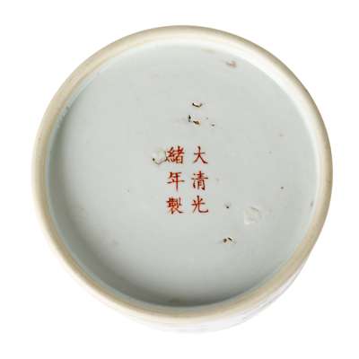 the exterior painted with ‘one hundred butterflies’ motif with occasional ‘double happiness’ characters in the middle, the base inscribed with a six-character Guangxu mark in iron-red