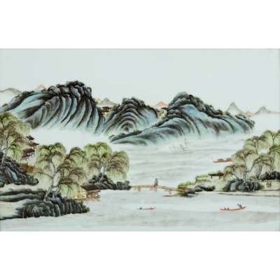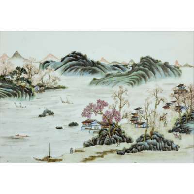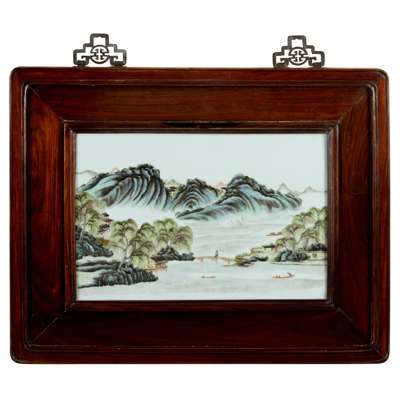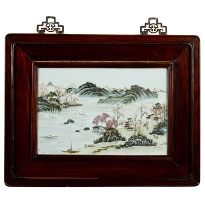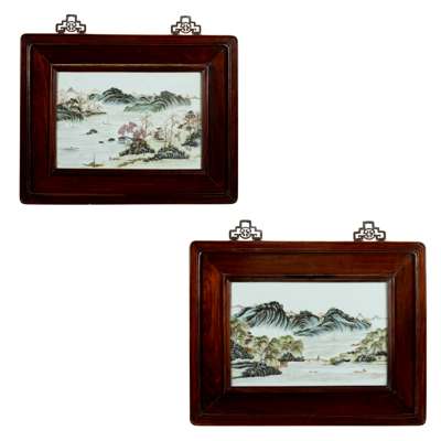 十九至二十世紀 粉彩山水圖瓷板 木框(兩件)