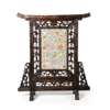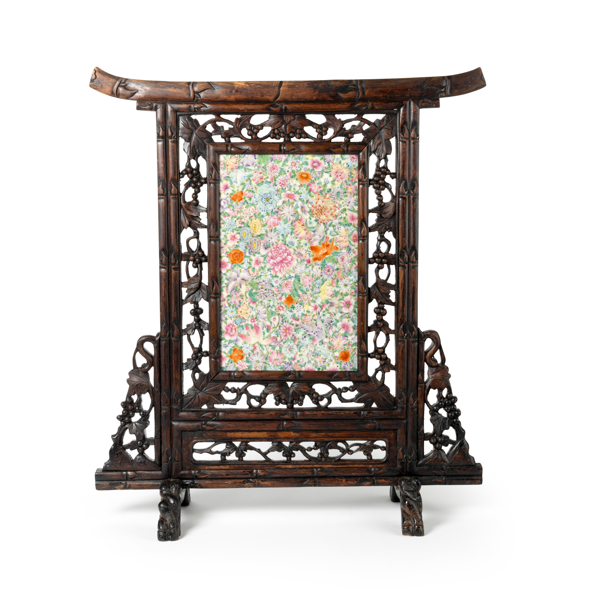 CHINESE FAMILLE ROSE 'MILLEFLEUR' PLAQUE INSET WOODEN TABLE SCREEN