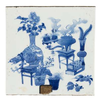 CHINESE BLUE AND WHITE 'BOGU' PORCELAIN PLAQUE