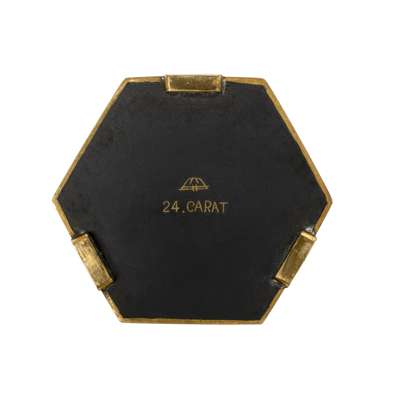 top of the hinged lid decorated with a pair of peacocks perching on a foliated tree branch, interior gilt and incised with a landscape, raised on low tripod supports, the base with a fuji motif and marked ‘24.CARAT’