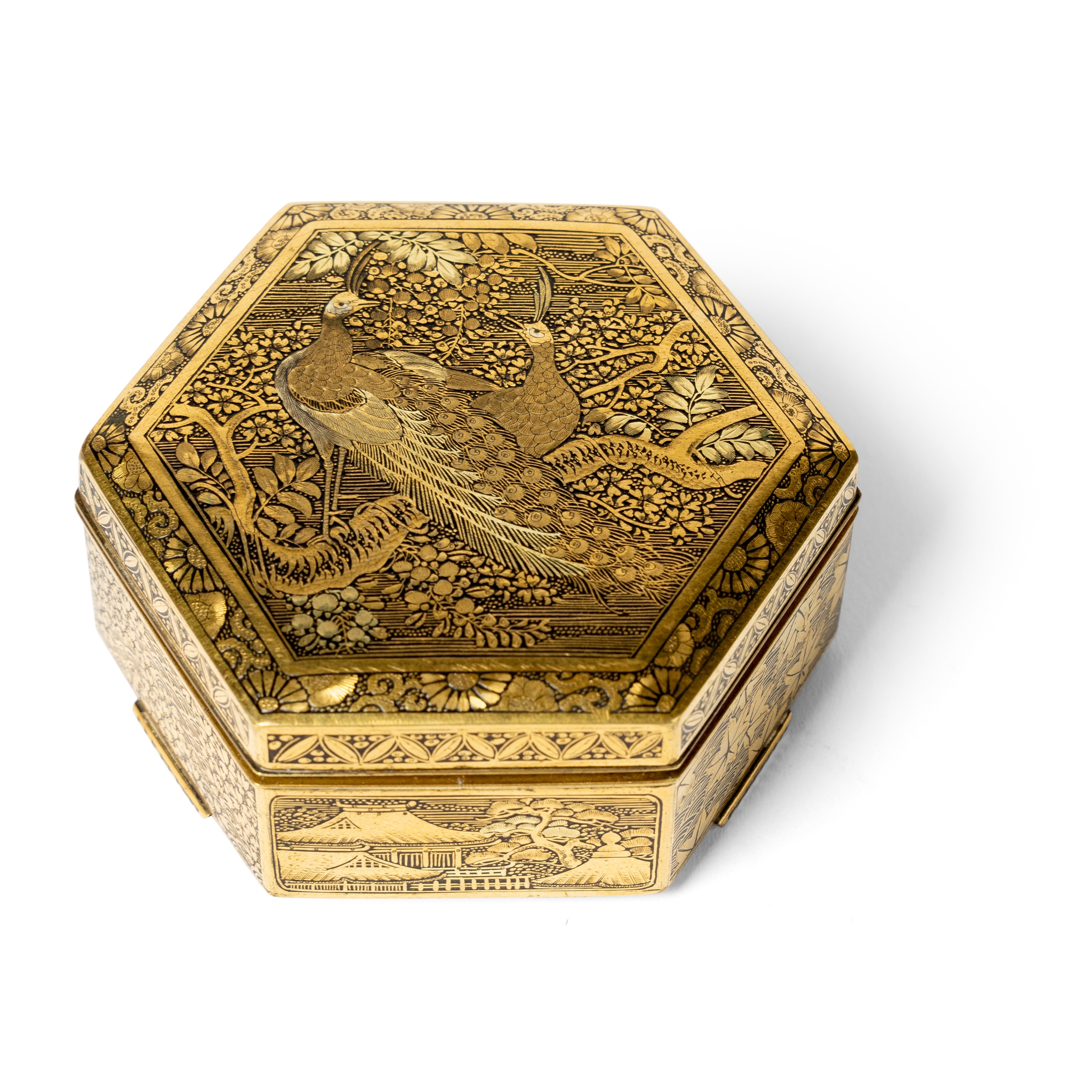 明治 京都住駒井風格 金工孔雀紋六角蓋盒