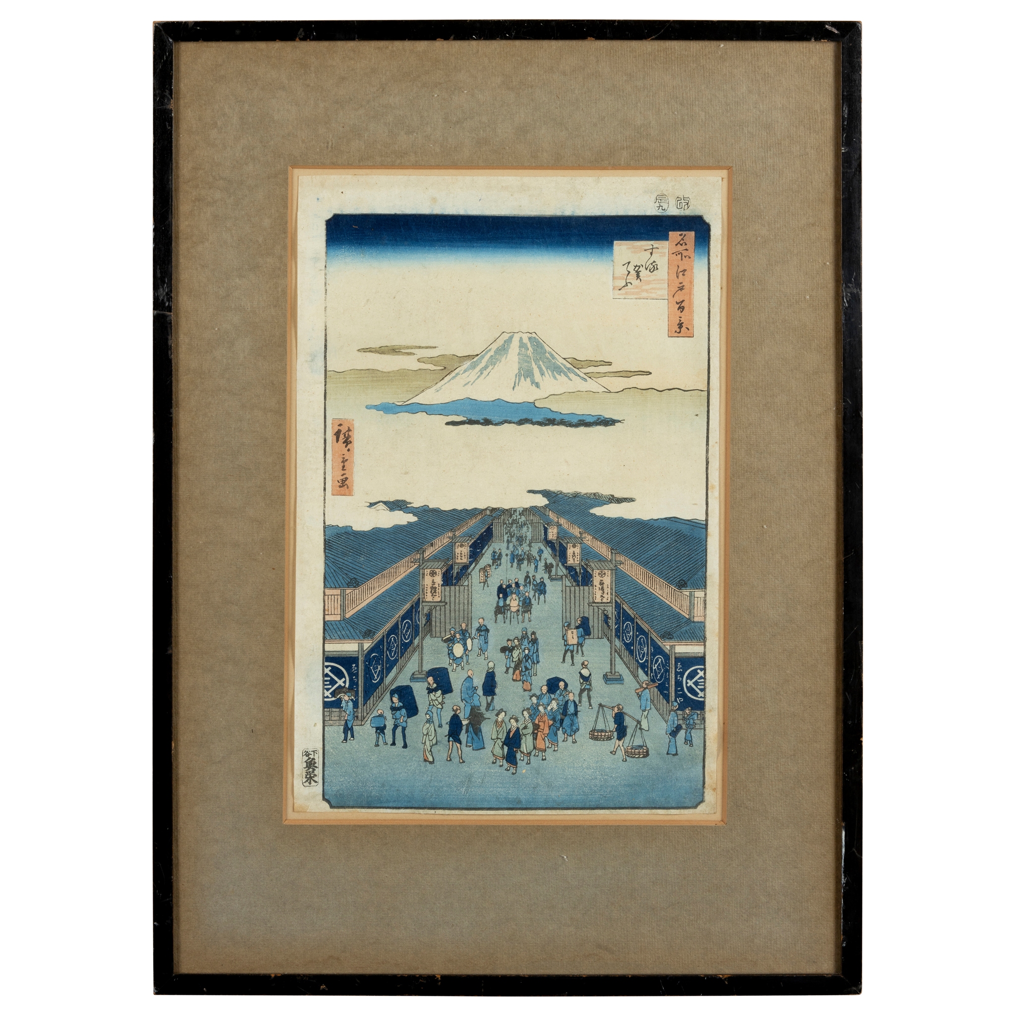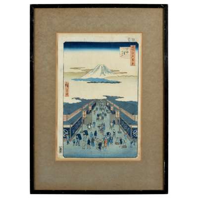 oban tate-e print, titled ‘Suruga-chô’, from the series One Hundred Famous Views of Edo (Meisho Edo hyakkei), framed