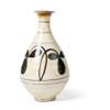 the pear-shaped bottle raised on a ring foot with its body entirely covered in white slip adorned with a stylised peony leaves in iron oxide, bordered by incised lines that expose the greyish stoneware beneath