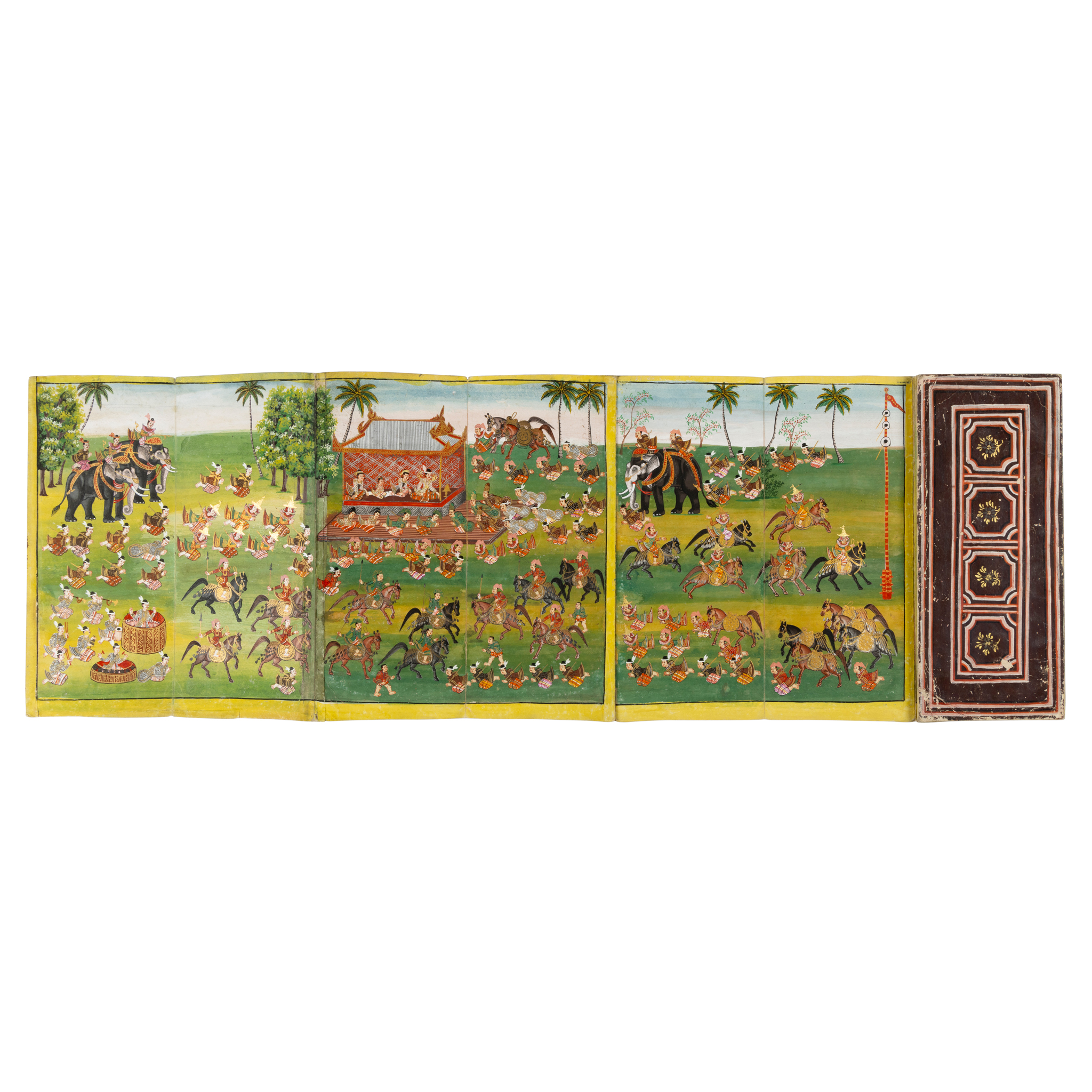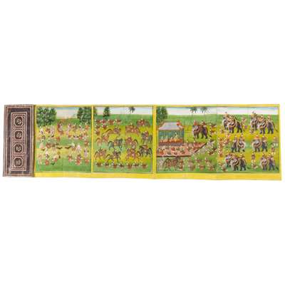 A comparable Burmese parabaik, dated to 1870s–1880s, from the Court of King Mindon or Thibaw, or associated workshops, is in The Metropolitan Museum, accession no. 2017.209. There are notable similar scenes in this parabaik, compared to the lot offered here. For example, the tiger and elephant fighting scene, the cock fighting scene, the procession scenes with elephants and gilded carriages, etc. According to the catalogue, the painting style was developed in the reign of King Mindon and continued under King Thibaw. It displays a hybridity born of traditional Burmese religious narrative painting blended with European pictorial devices.