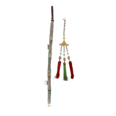 the belt with five white metal ‘scrolling tendril’ panels sewn on textile, metal buckle and leather end; the belt pendant with a strain of rosette chain coming down to a Kirtimukha plaque further with three rosette chains and three tassels (2)