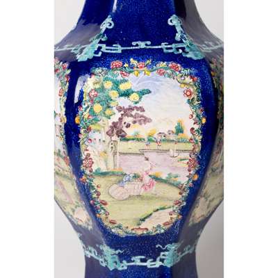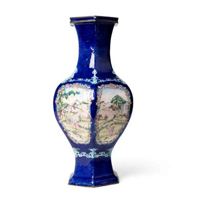 清 廣東銅胎畫藍地琺瑯歐洲人物生活圖六角大瓶