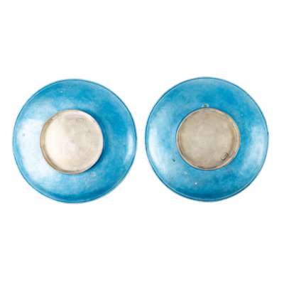 each vibrantly enamelled in the interior with a crane perching on a pine tree, the other in flight, all enclosing a taiji medallion, further detailed with fine incision, outer cavetto covered in pale blue enamel, the base applied with a small rectangular panel marked ‘Chongqing Fang Jiu Xia’ (2)