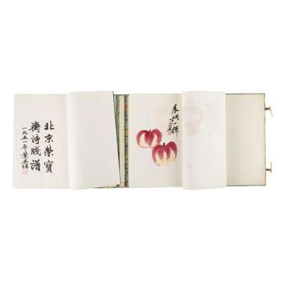 two thread-bound books in a silk-bound case, all titled ‘Beijing Rongbaozhai Xinji Shijianpu’, with 120 colour woodblock prints of letter papers by Qi Baishi, Chen Banding, Tang Dingzhi, and many others