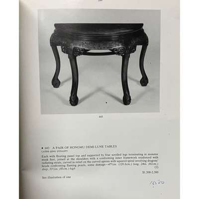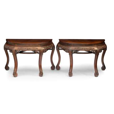 PAIR OF CARVED HARDWOOD DEMI-LUNE TABLES, YUEYAZHUO