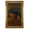 painted on wooden board with a standing beauty against a large pine tree facing a seated boy carrying a hat on his back, with gilt-wooden frames