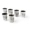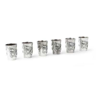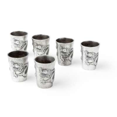 each of tapered beaker form, probably made for vodka shots, decorated with a trailing dragon on chiselled ground, the base with hallmark ‘Tu Mao Xing’ and ‘Jiu Jiang’ (6)