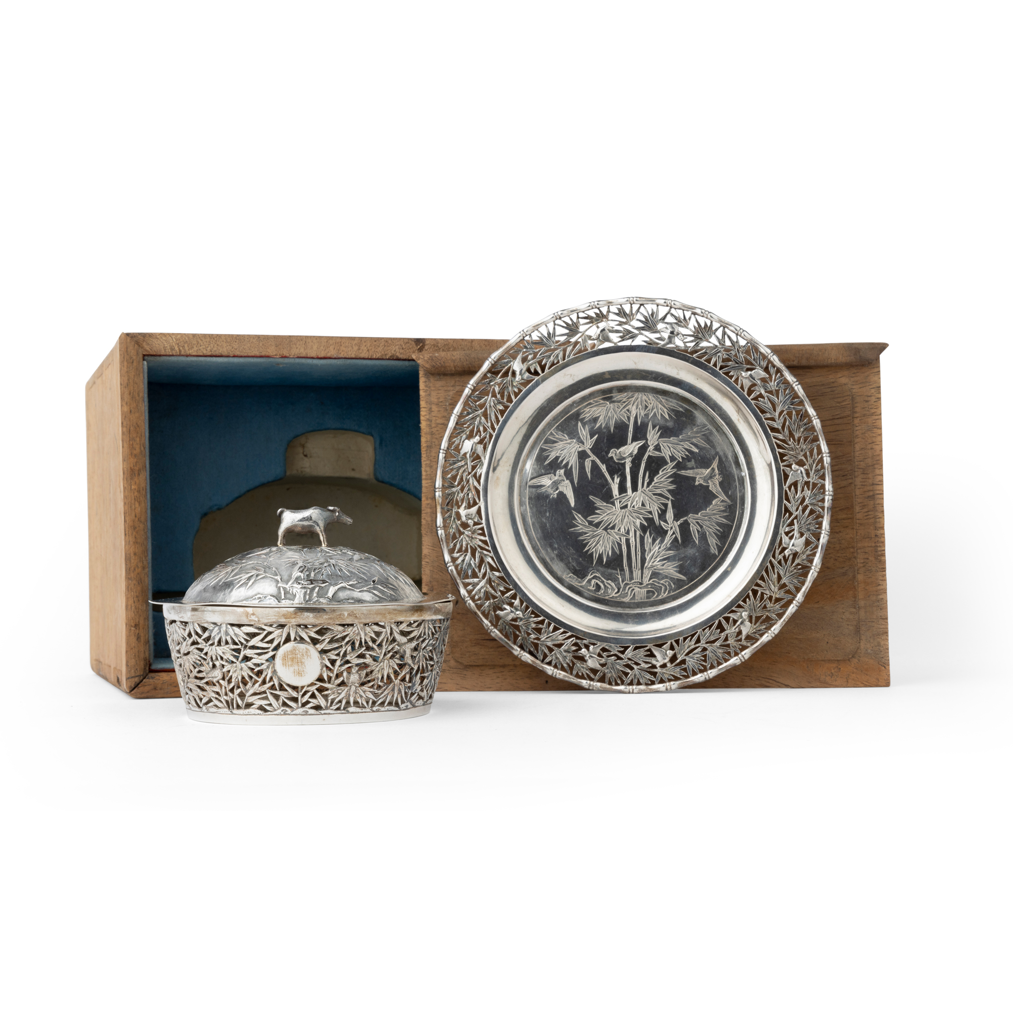 清末民初 「LUENWO」、「春」錘印款 外銷銀竹鳥紋透雕圓盒 連蓋及托 帶木盒
