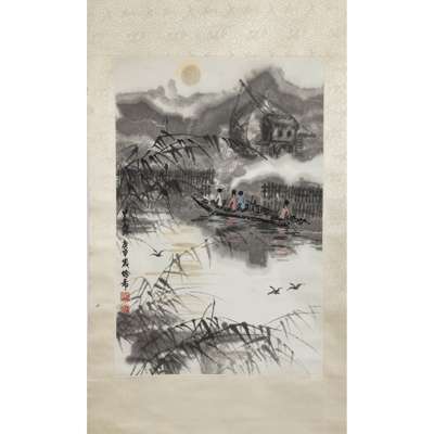 CHINESE INK PAINTING OF FIGURES ON SAMPAN