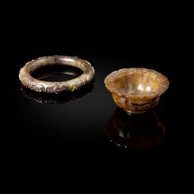 明或更早 青玉帶沁雕花口杯 及 青玉帶沁雕十二生肖手鐲 (共兩件)