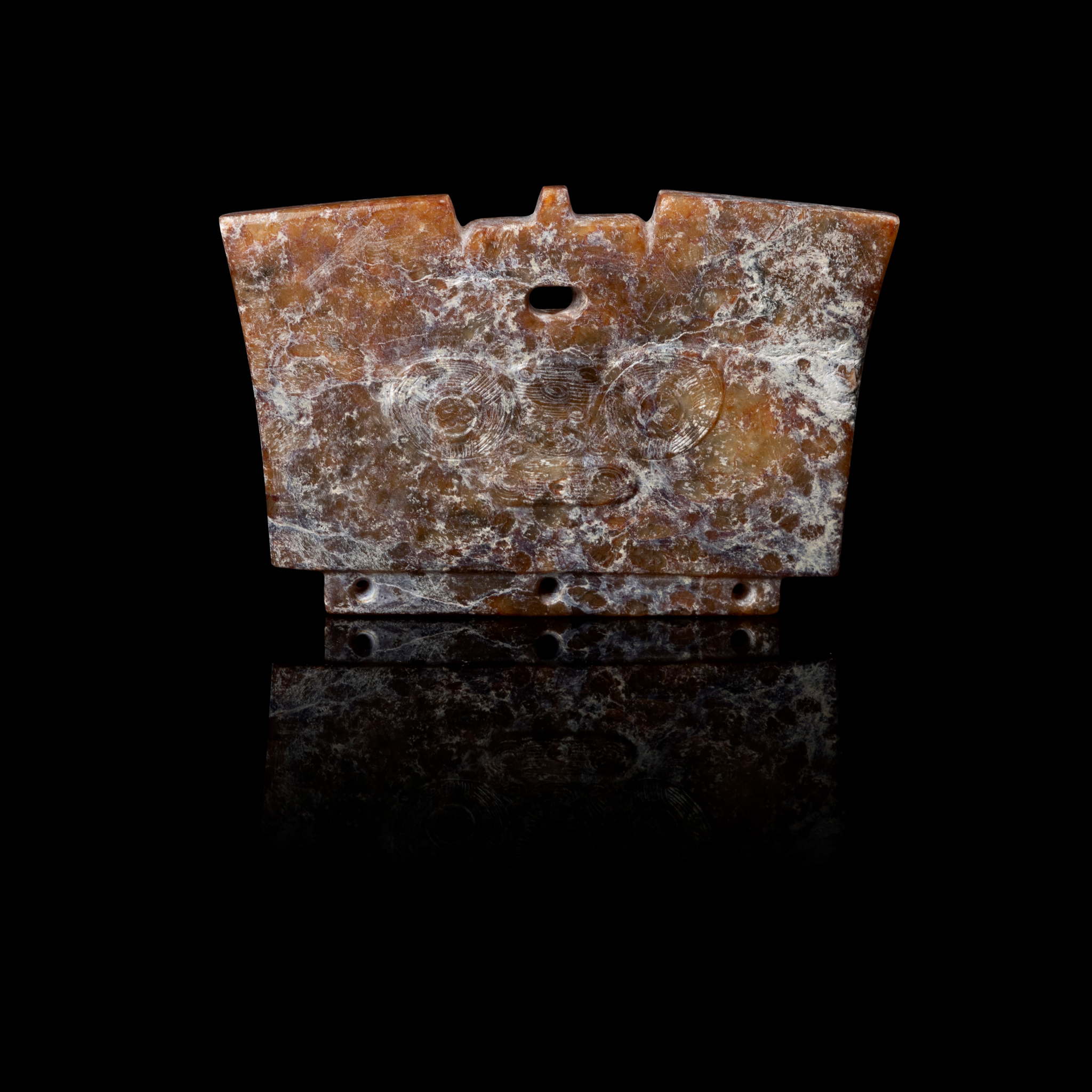 carved with a mythical animal taotie mask on one side, the rectangular-like plaque with four drilled holes, one above the taotie mask, and the other below