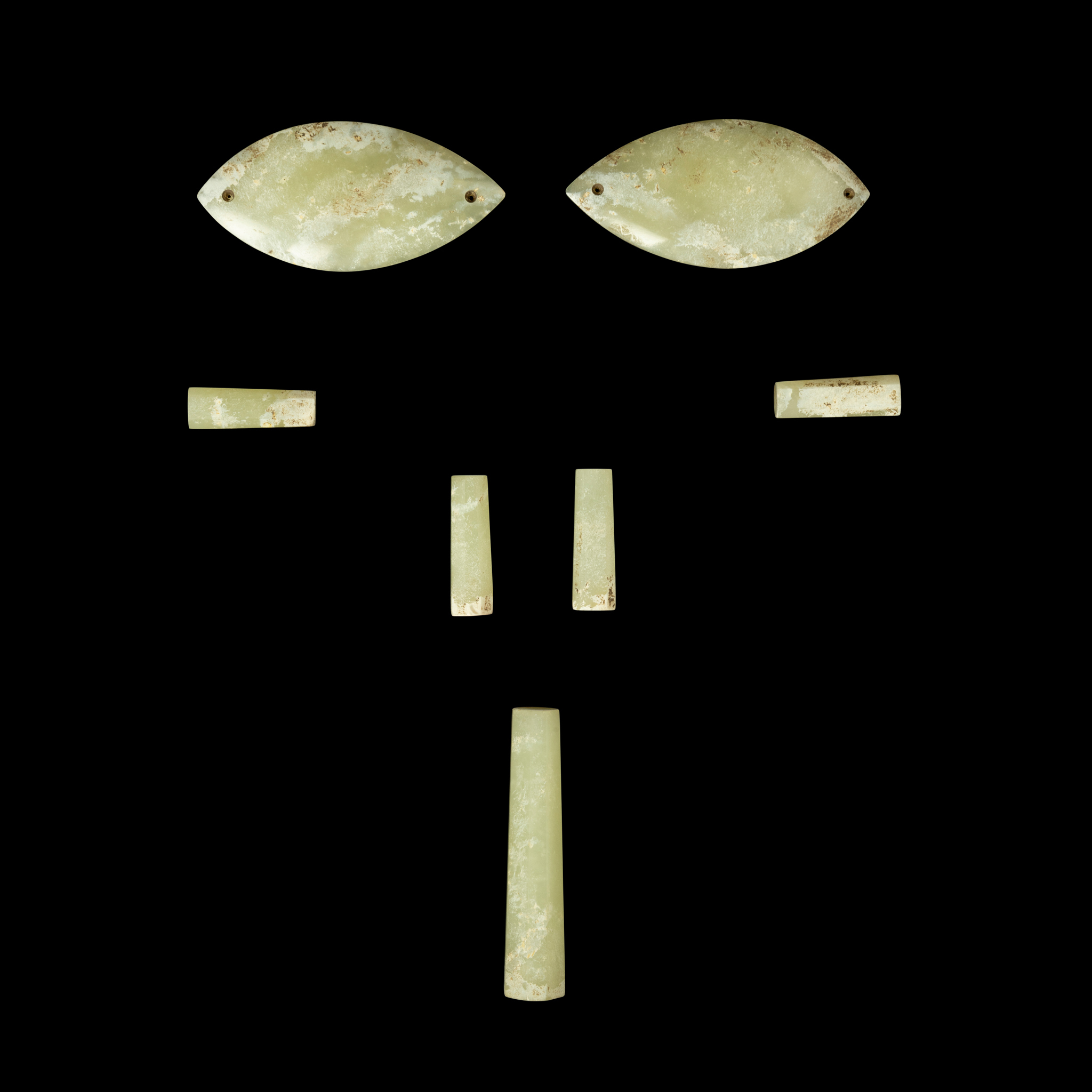 comprising: a pair of eye covers, either end with a drilled hole; and five octagonal-shaped plugs of different sizes, each jade with white inclusions (7)