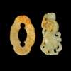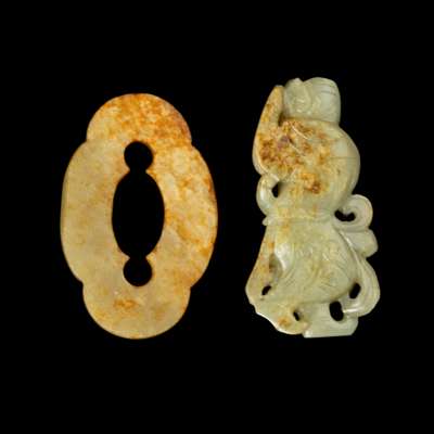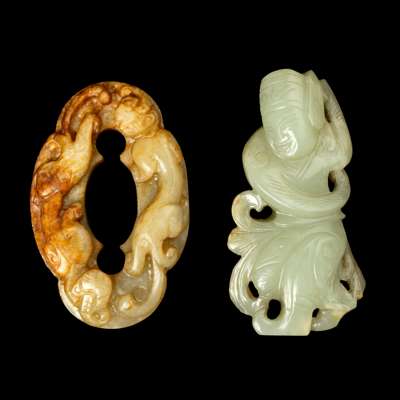 one jade carved in the form of a male dancer in motion with raised arms; the other foliated sword fitting carved with two sinuous chi-dragons on one side (2)