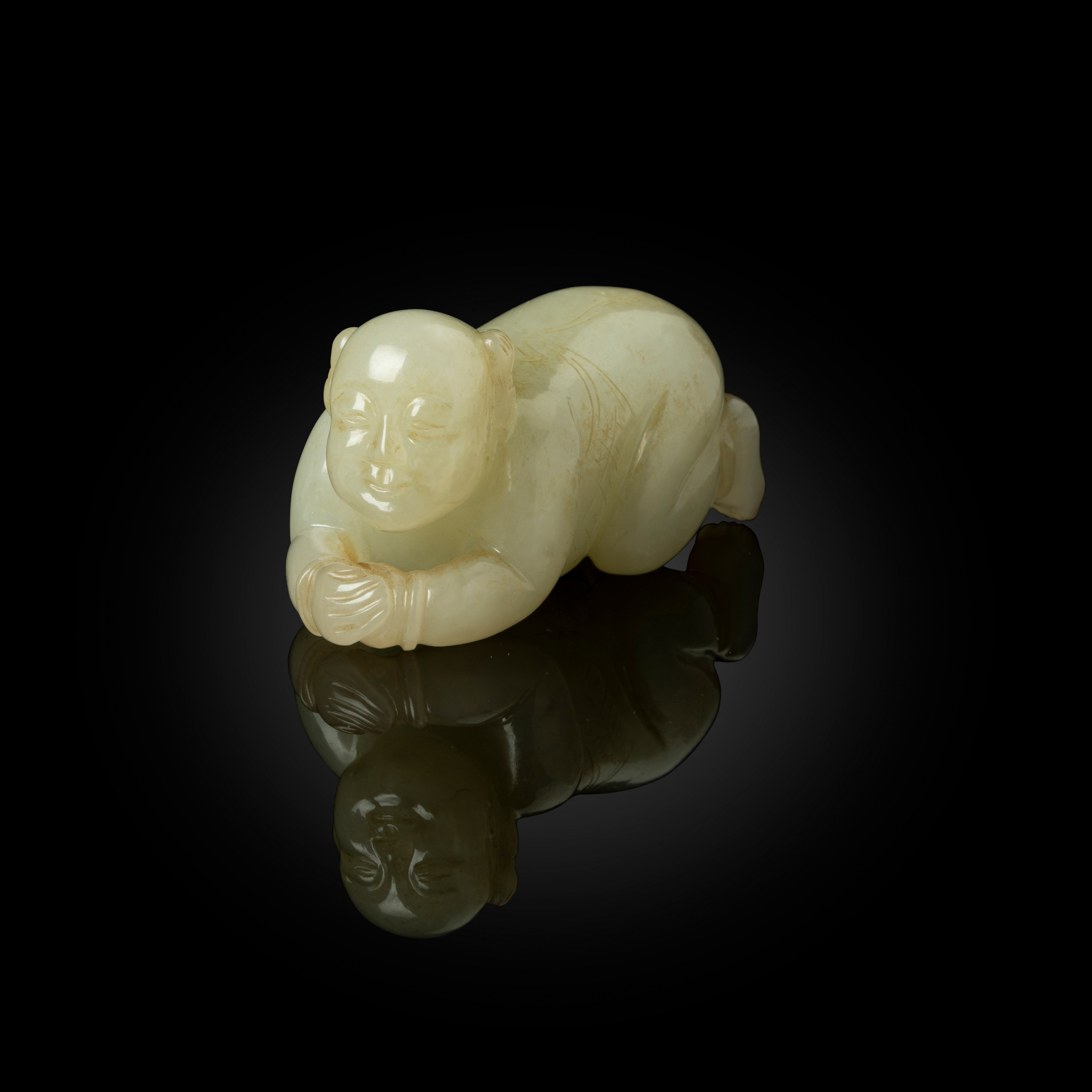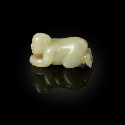the recumbent babe with two hands holding in front on the floor, wearing a dudou tied with a knot on the arched back, the joyful face well defined, the stone of white colour with some yellowish inclusions